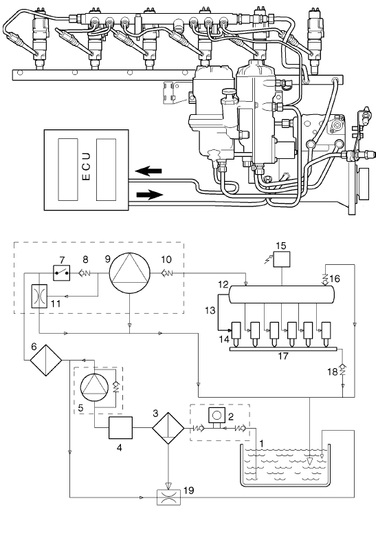 1 Снимите возвратную магистраль, заглушите топливную рампу (9-13 л) или топливный насос высокого давления (16 л). Опустите пластиковый шланг в сухую ёмкость, чтобы можно было обнаружить незначительное количество топлива.