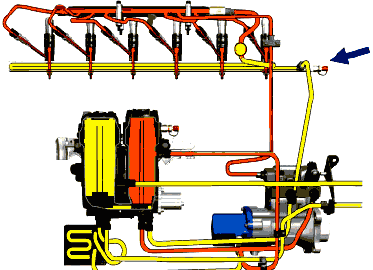 Подключите прибор для измерения давления 99362 к контрольному штуцеру на рампе обратного слива. Оно не должно превысить 0,8 атм. В случае превышения - в какой-то форсунке утечка, проверьте баланс по цилиндрам.